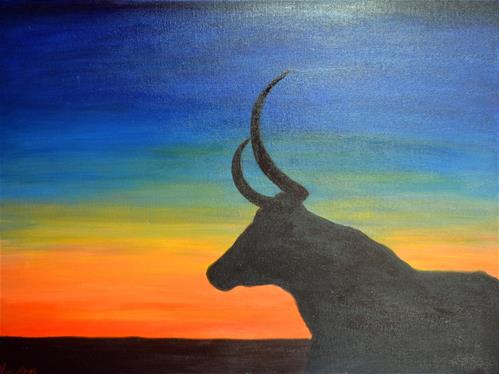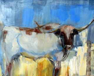 This Longhorn bull is warming up in the Texas Sun. I used several values of purple for shading and then warmed him up with shades of burnt sienna.