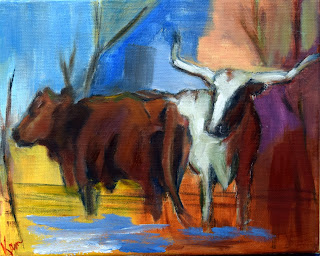 There is nothing as stately or majestic as a longhorn bull as he looks over his harem. This picture was drawn out with watercolor pencil and turpentine and then I mixed the colors in oil... 8 x 10 wrapped canvas.