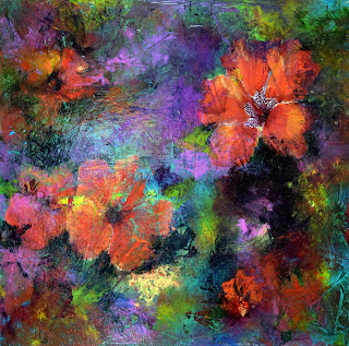 Here is an example of layers of colors on a textured canvas with my painting "Habiscus Abstraction"